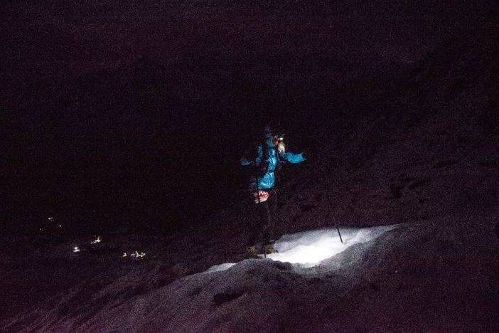 赛道最难的一段,雪坡横切,没过小腿的积雪让我无比亢奋,这才是我的菜!黎明尚未到达,黑暗的冰雪世界里只剩头灯照亮的一小部分,我专注于身前一个又一个踩出来的雪坑,让自己的脚印尽可能重叠其中,甚至忘记了时间的流逝,尽管一路上脚下打滑7,8次,却反而觉得摔进雪里很有趣。