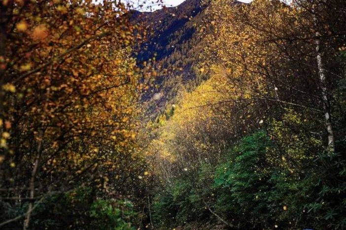 海子沟西侧山坡,霜凝结在灌木和泥土上晶莹泛白,直到太阳从云的彼端升起,暖暖的光线染红了坚硬冷酷的雪山群,整个世界都在日照金山,幺妹峰海拔6250米金字塔般的山尖在崇山峻岭间矗立,而脚下的花海子像是上帝在杜鹃林和草甸之间打翻了一瓶绿色的墨水,这样的赛道风光,真的是天地有大美而不言。