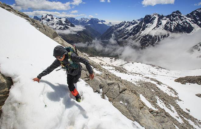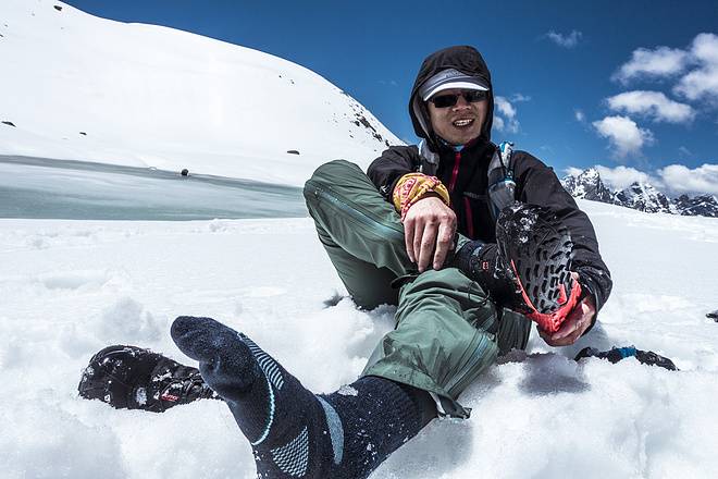 所幸有了上次测线翻越羊满台垭口身陷雪坑的惨痛经历,这点难度已经不足为惧了。CP2到CP3这段横切耗时2:13,比预计的2小时要多。天公作美,看到日照金山,驻足欣赏、拍照留念,这段赛道风景是赛事精华之处。