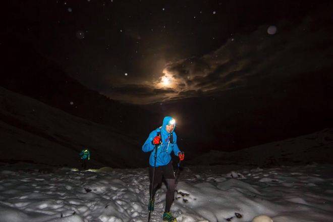 在赛段临近结束的时候,风雪戛然而止,万籁寂静,一轮明月之下,四周巍峨雪山环抱,那感觉只有独处山间的人才能体会。原本预计1个半小时的赛段我们耗时将近3小时才完成,CP9凼岗药终于到了,离关门时间只剩2分钟。志愿者给我们打卡的同时,告诉我们比赛因为暴风雪中止了。