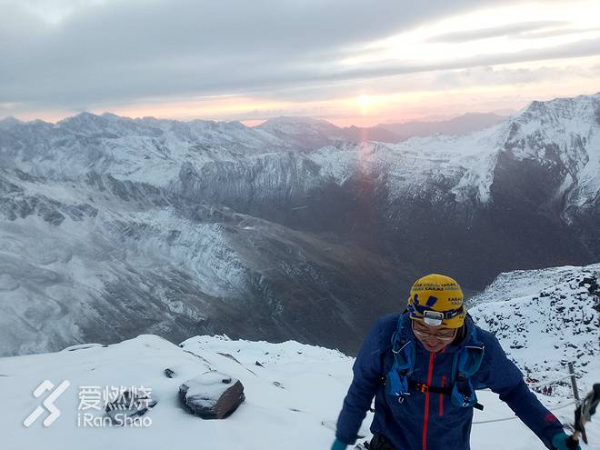 5千米的垭口平台之上,天色微亮,红日从远方的云层中穿透过来,二峰之巅笼罩在白色雪雾之中,沿着固定好的铁栏杆徐徐上升,7点半终于站上二峰之巅。