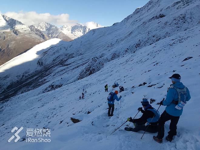 陡直的爬升过程中,小腿肌肉一直在紧张收缩,要命的是体力开始下降,爬个两三步,得撑着登山杖,大口吸着冰冷而新鲜的空气,然后回头看看山坡上紧跟其后的其他跑友,接着再把以上的动作重复做。