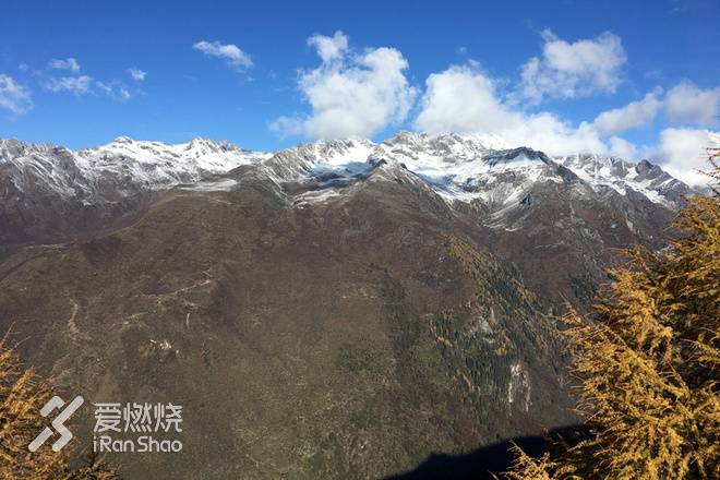 两三分钟后我不舍的转身朝右侧的陡峭的雪坡开始下降了,大概20分钟后我一路下撤至下方草坡平台边缘,此时眼下出现了金黄色树林,在下方镶嵌着大海子和花海子,在花海子端头便是花海子CP3。而在视线的上方缥缈的云层之上,一抹炫目的金色点燃了整个冰冷的天空,我再次被迷住站在原地静静的仰望着这撼动人心的画面。后面几名队员超过我也没有让我动摇,在这里我足足待了5分钟后才继续下撤至花海子补给点。