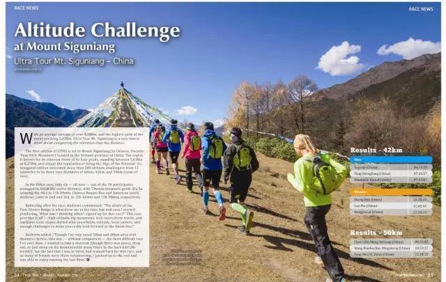 在最新一期2016-1/2月的《ASIA TRAIL》杂志中也有关于凯乐石环四姑娘山超级越野跑赛事的报道,标题为“四姑娘山的海拔挑战”。