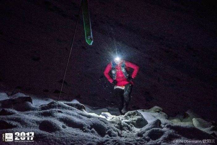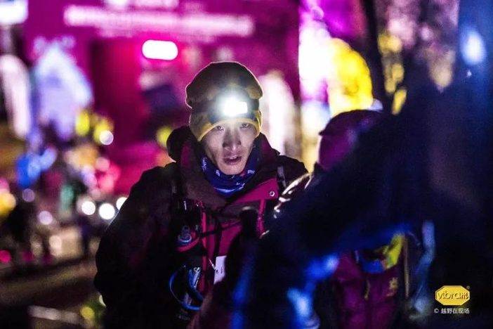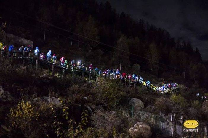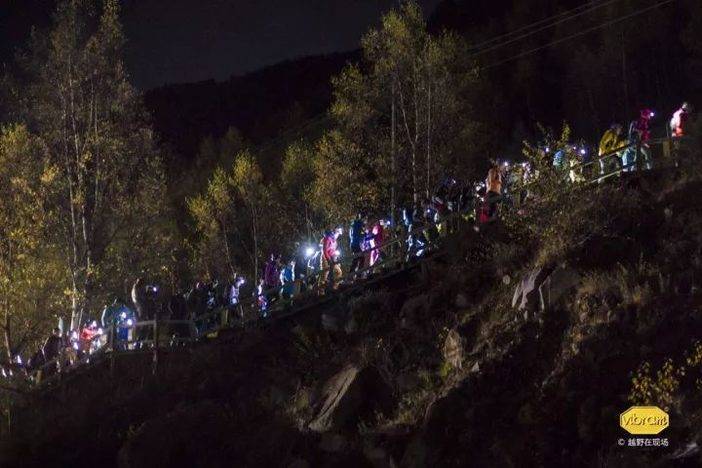 在黑夜中,选手们的头灯形成了一条长长的灯龙。
