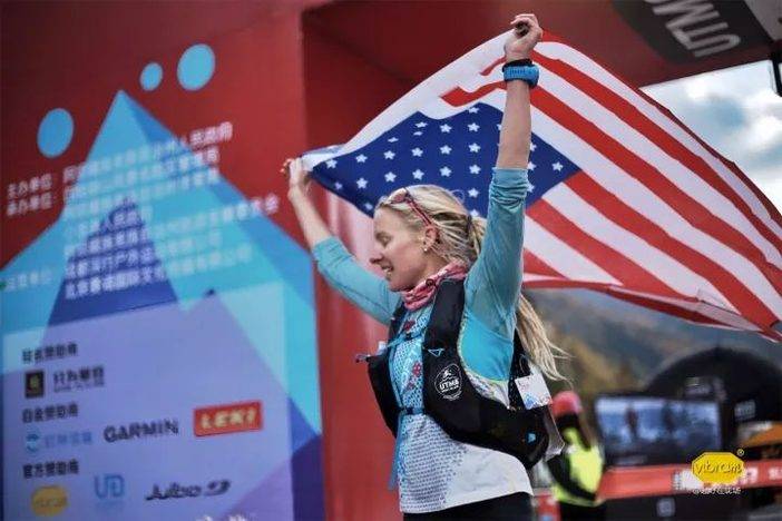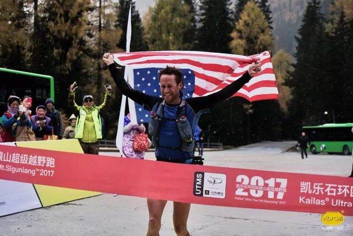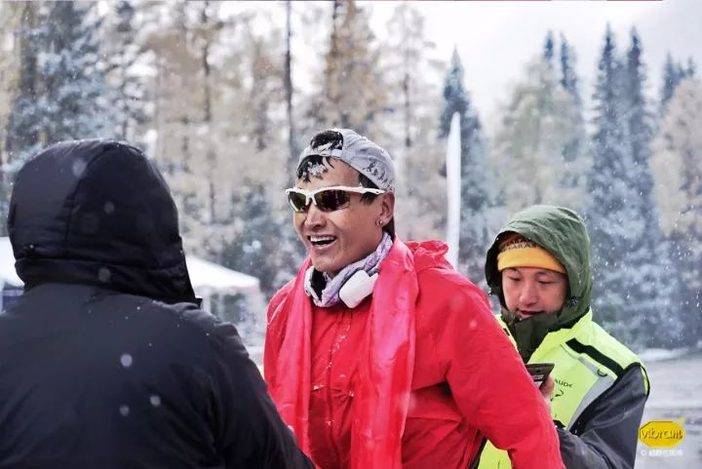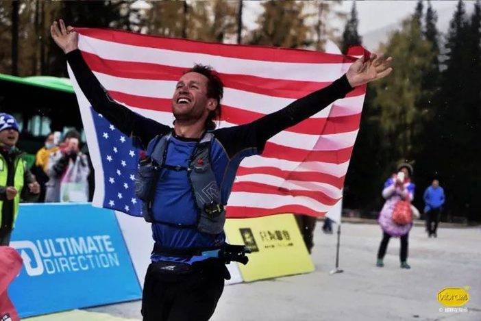 然而,就在Jason Schlarb即将到达100公里的终点时,雪却又零零星星的下了起来,逐渐越下越大,整个四姑娘山被雪蒙上一片白色。在下午5点03分时,红杉林迎来了它的第一位选手,来自美国的Altra精英运动员Jason Schlarb(2016年硬石100冠军)披着星条旗微笑着冲过终点,赢得了这场高海拔赛事的冠军。