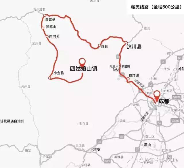 成都→成灌高速都汶高速入口→都汶汶川出口→汶川→理县→卓克基→梦笔山,两河→小金→四姑娘山镇