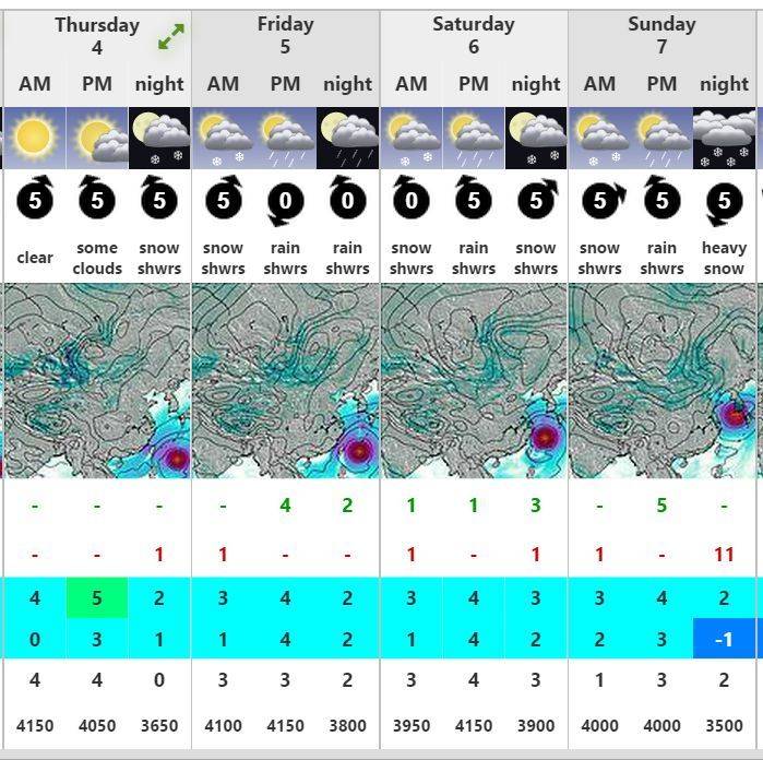 我们本次的天气数据采用了专业的山地天气预报网站mountain-forecast.com的数据,它几乎覆盖了世界是所有有命名的山峰,可以通过搜索山峰名称,获得不同攀登时间,早中晚不同时段的温度、风速、降雪、雪线等参数。虽然天气预报不一定完全准确,但我们可以获得有价值的参考信息。