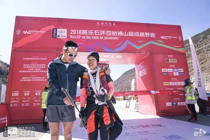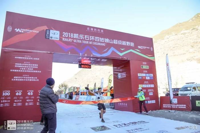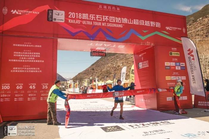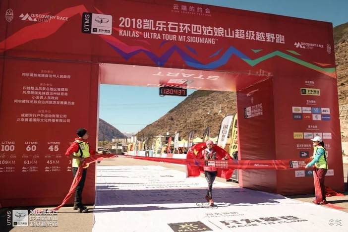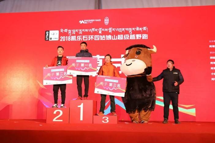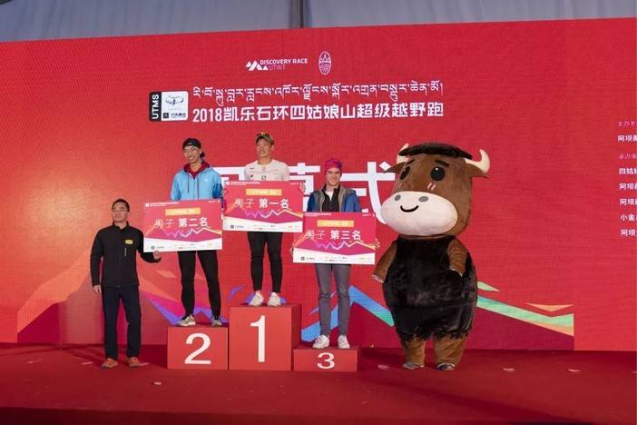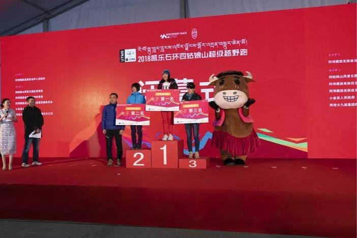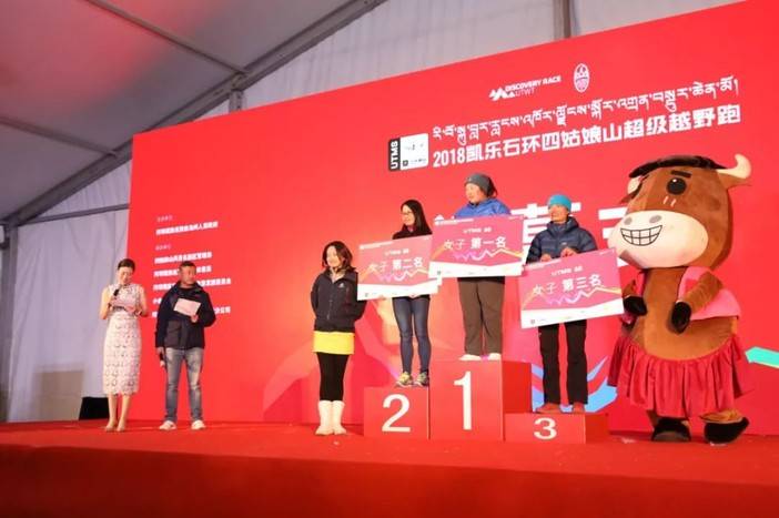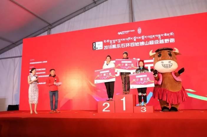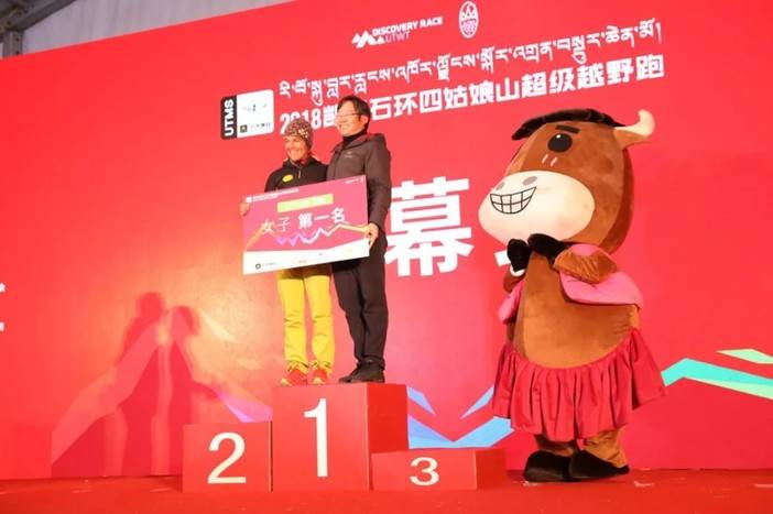 四姑娘山户外中心主任杨伟太宣布UTMS100男女前三名成绩,阿坝州体育局党组成员贺烽为女子前三名颁奖。由于还未到关门时间,暂时只有女子第一名出炉。