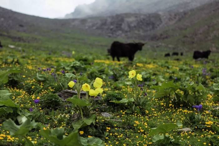 看远处山谷绿的发亮,于近处高山草甸偶遇牦牛低哞。