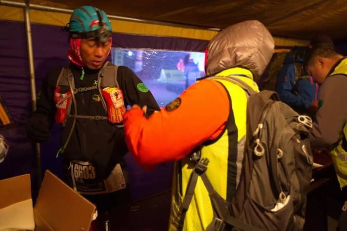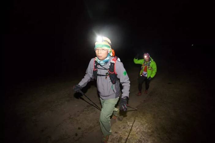 从大峰下来我的胃也变得有些难受,艰难的走到大黄棚子时,差点被关了门,不少跑友因为高反或者扭伤等原因在帐篷休息,但却依然洋溢着微笑,给我们继续比赛的加油,而医生们的尽职尽责也让我们感动。返程途中,难受时坐在路边,后面来的跑友都问我需不需要帮助也让我一阵温暖,晚上7点过天完全黑了还好有一队跑友结伴而行,并送了我一组电池,或者正是他们给予我的帮助,也让我充满了力量,虽然一路呕吐但还是在晚上8点过到达了终点,这时已超过关门时间两个多小时。