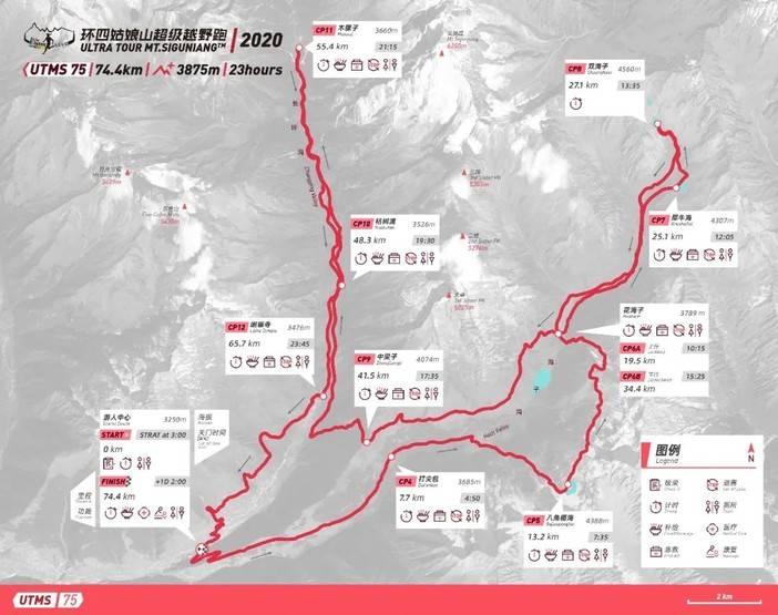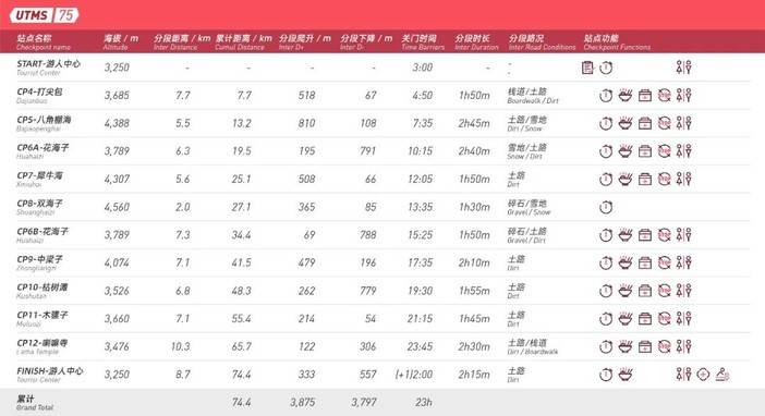 和UTMS75比较,本赛道减少了海子沟的大黄棚子、犀牛海、双海子区域技术路线,以及长坪沟到木骡子的8.5公里折返的长距离路线。