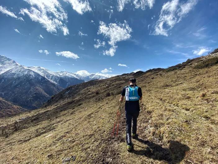 UTMS虽然是Tim首场高海拔赛事,但他对高海拔并不陌生,生活在加州的马麦斯湖区域(Mammoth Lake),当地平均海拔2000米左右。不过到达日隆镇后,他还是被群山环绕的壮美景观所折服,直言堪比欧洲的勃朗峰群山。抱着对山野满满的热爱与憧憬,抵达后第二天便决定一探大峰,从景区入口出发到大峰一路,有成熟的徒步线路,沿途更有秀美景色,Tim将此次攀登作为赛前的适应活动(不建议初到高海拔的朋友们像他看齐)。