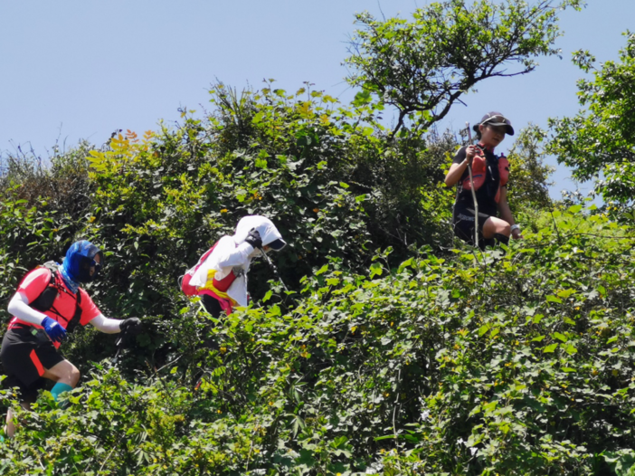 第二天的越野跑从美女峰山水世界景区出发,线路大约26公里多,大家将以自补给、自导航的方式进行。当天最高气温达30多度,出发前大家都多带了水,但原始够野的线路超乎大家的想象。高温、暴晒、缺水,杂草丛生的小路,无不考验着每个人。最终仅有5名队员完成了全程线路,其余一大半的队员,理智地选择了在线路途经的一个村庄搭车退出,虽没有完整跑完,但大家普遍表示非常喜欢这条线路。
